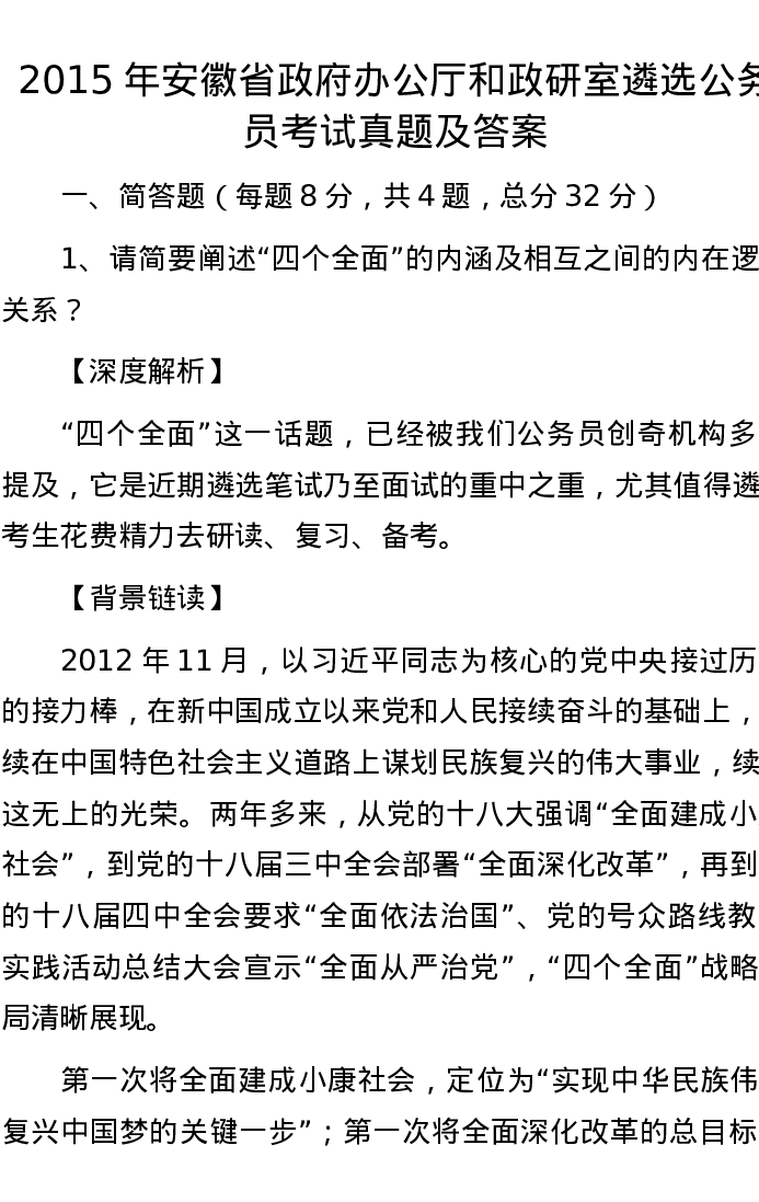 2015年安徽省政府办公厅和政研室遴选公务员考试真题及答案
