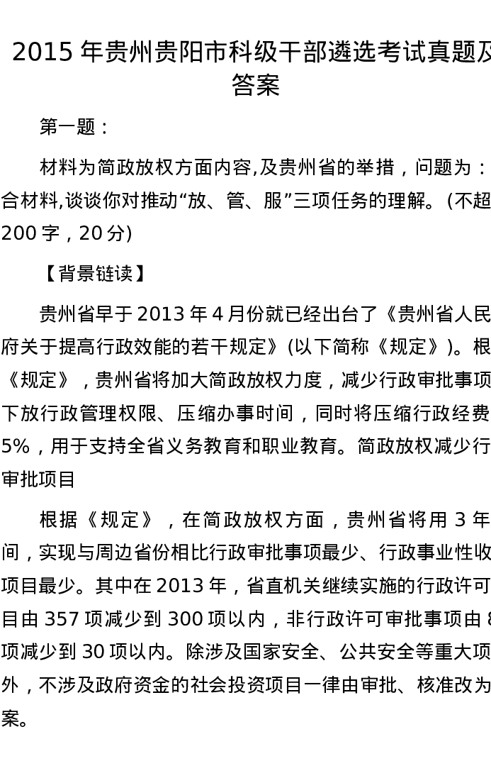 2015年贵州贵阳市科级干部遴选考试真题及答案
