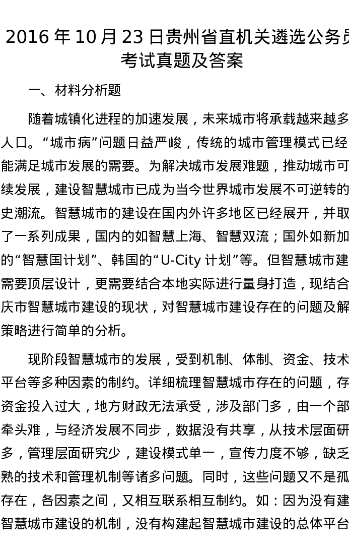 2016年10月23日贵州省直机关遴选公务员考试真题及答案