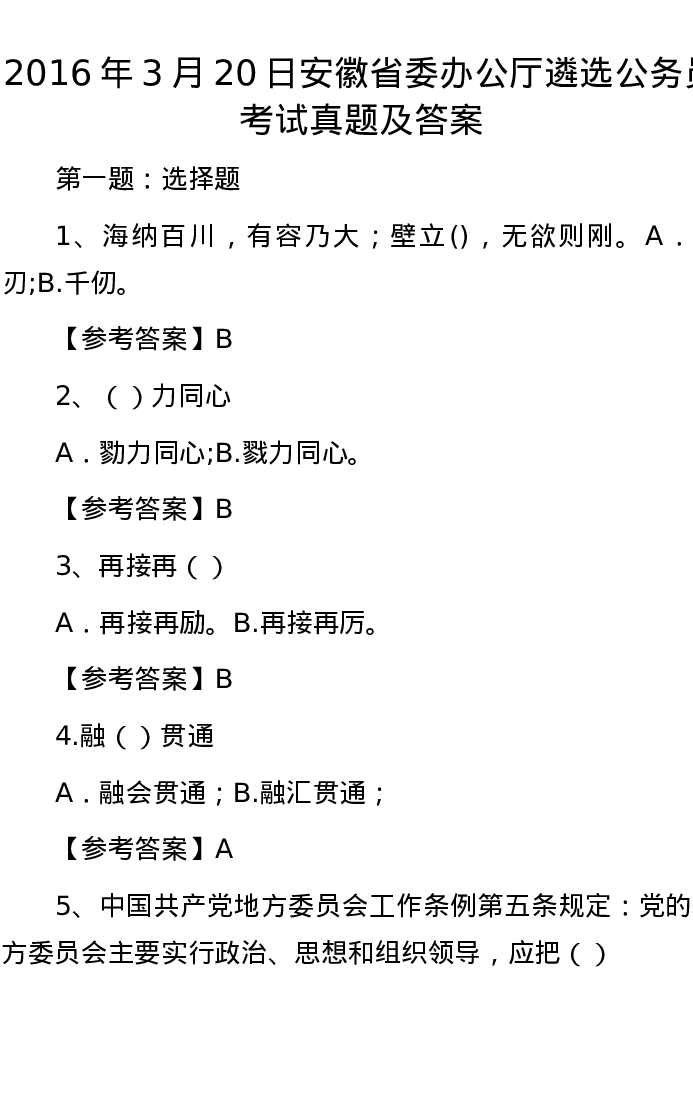 2016年3月20日安徽省委办公厅遴选公务员考试真题及答案