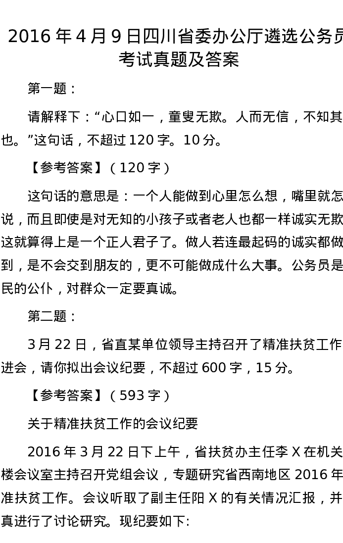 2016年4月9日四川省委办公厅遴选公务员考试真题及答案