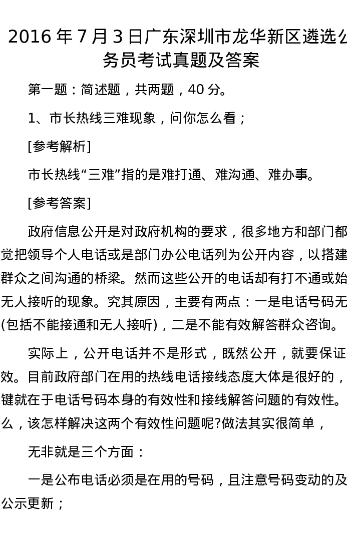 2016年7月3日广东深圳市龙华新区遴选公务员考试真题及答案