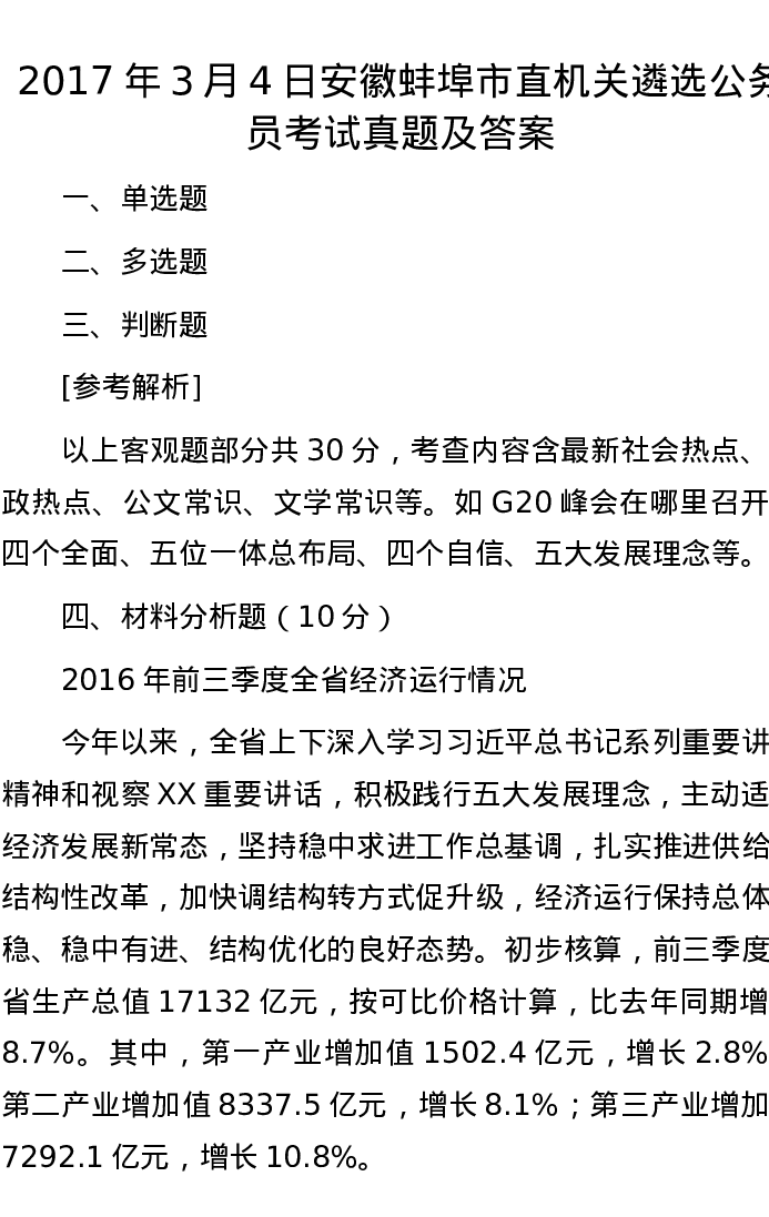 2017年3月4日安徽蚌埠市直机关遴选公务员考试真题及答案