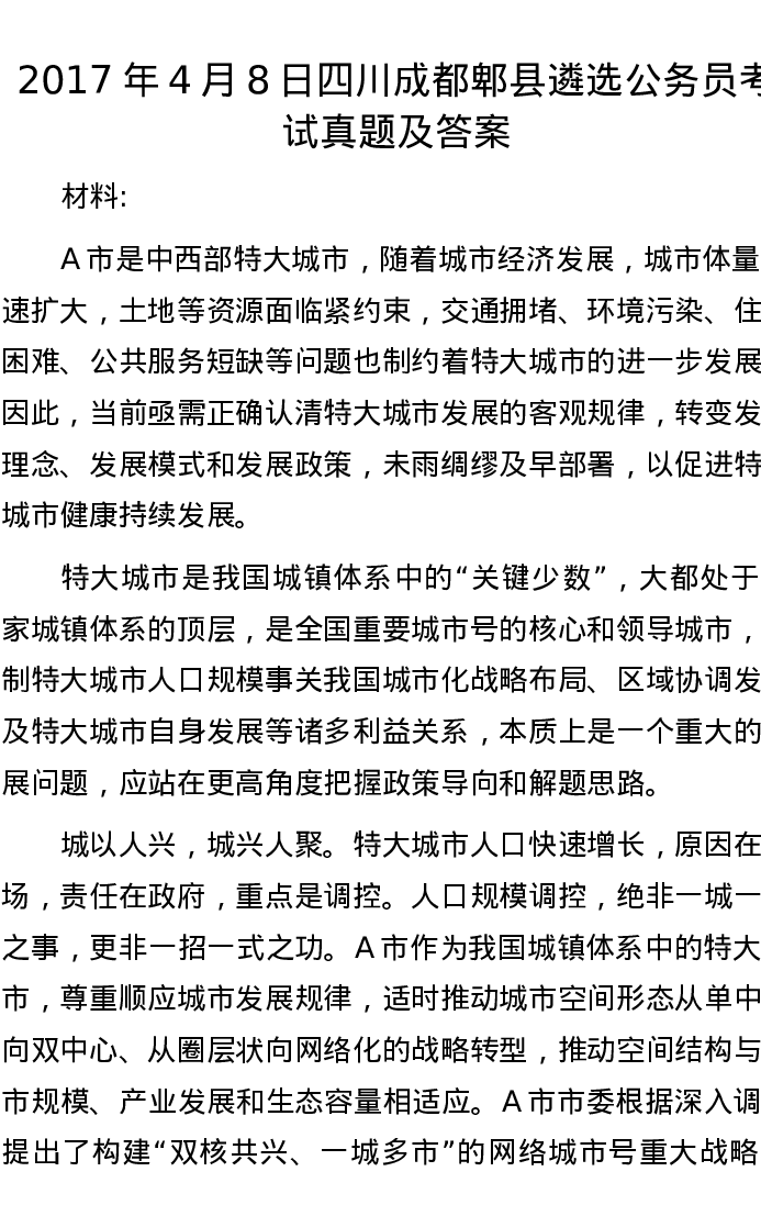 2017年4月8日四川成都郫县遴选公务员考试真题及答案