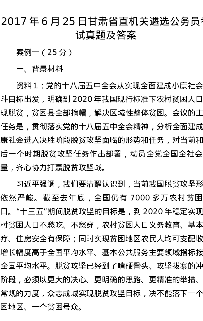 2017年6月25日甘肃省直机关遴选公务员考试真题及答案
