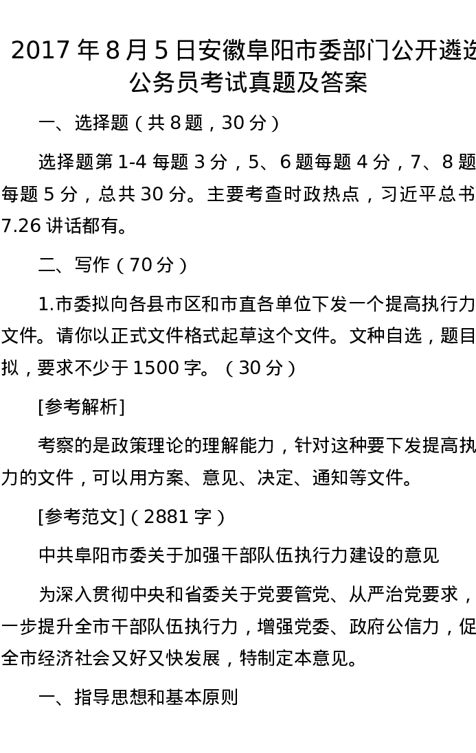 2017年8月5日安徽阜阳市委部门公开遴选公务员考试真题及答案