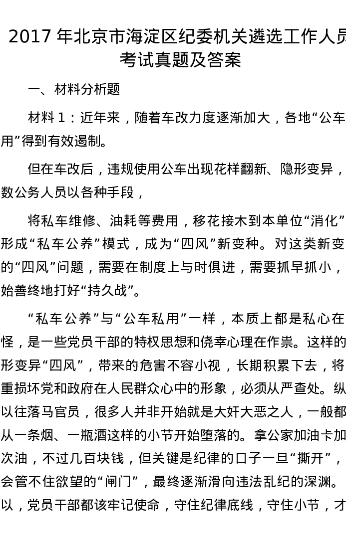 2017年北京市海淀区纪委机关遴选工作人员考试真题及答案