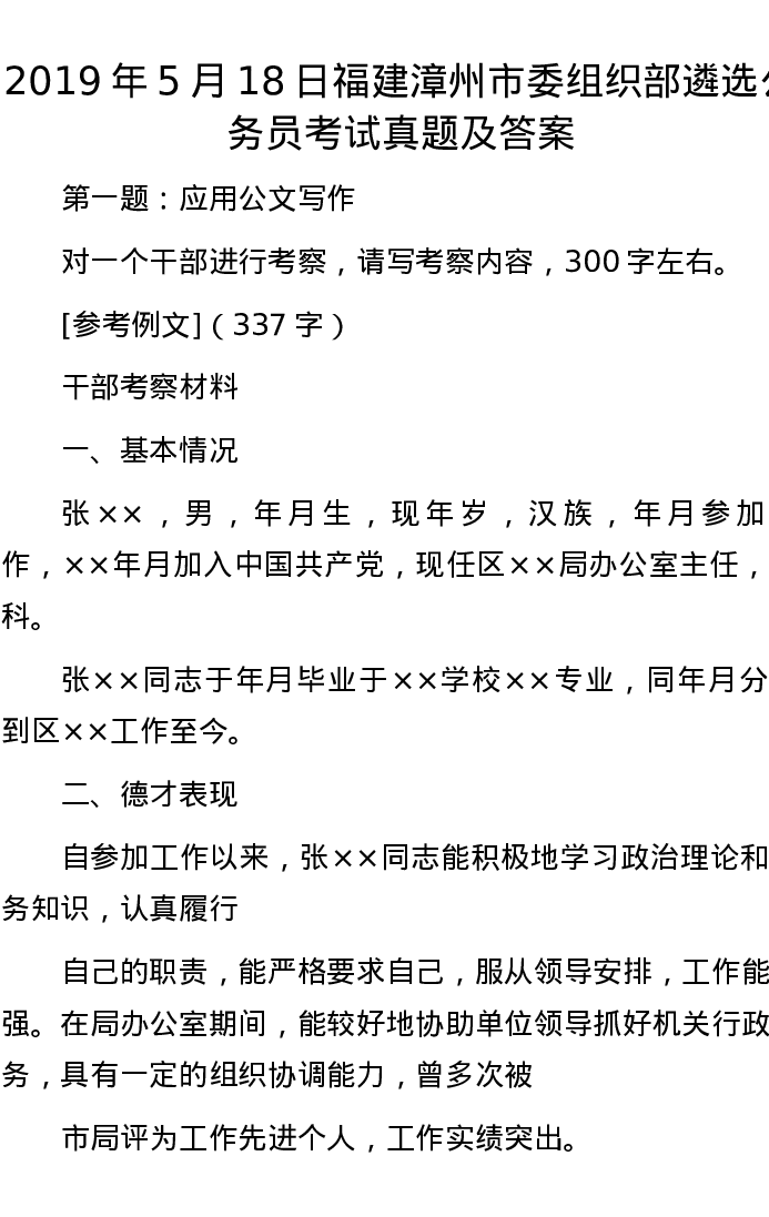 2019年5月18日福建漳州市委组织部遴选公务员考试真题及答案