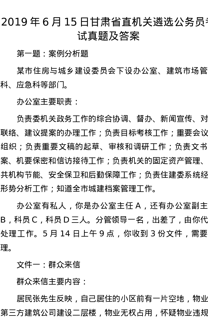 2019年6月15日甘肃省直机关遴选公务员考试真题及答案