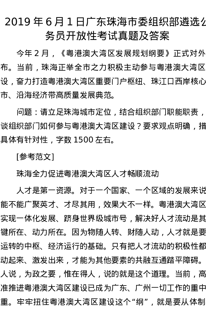 2019年6月1日广东珠海市委组织部遴选公务员开放性考试真题及答案