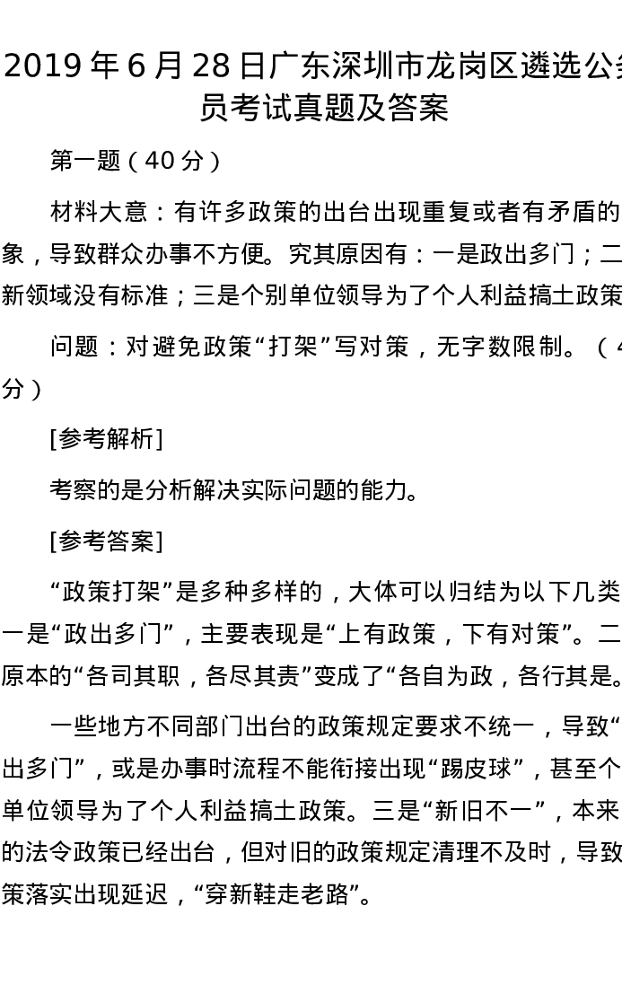 2019年6月28日广东深圳市龙岗区遴选公务员考试真题及答案