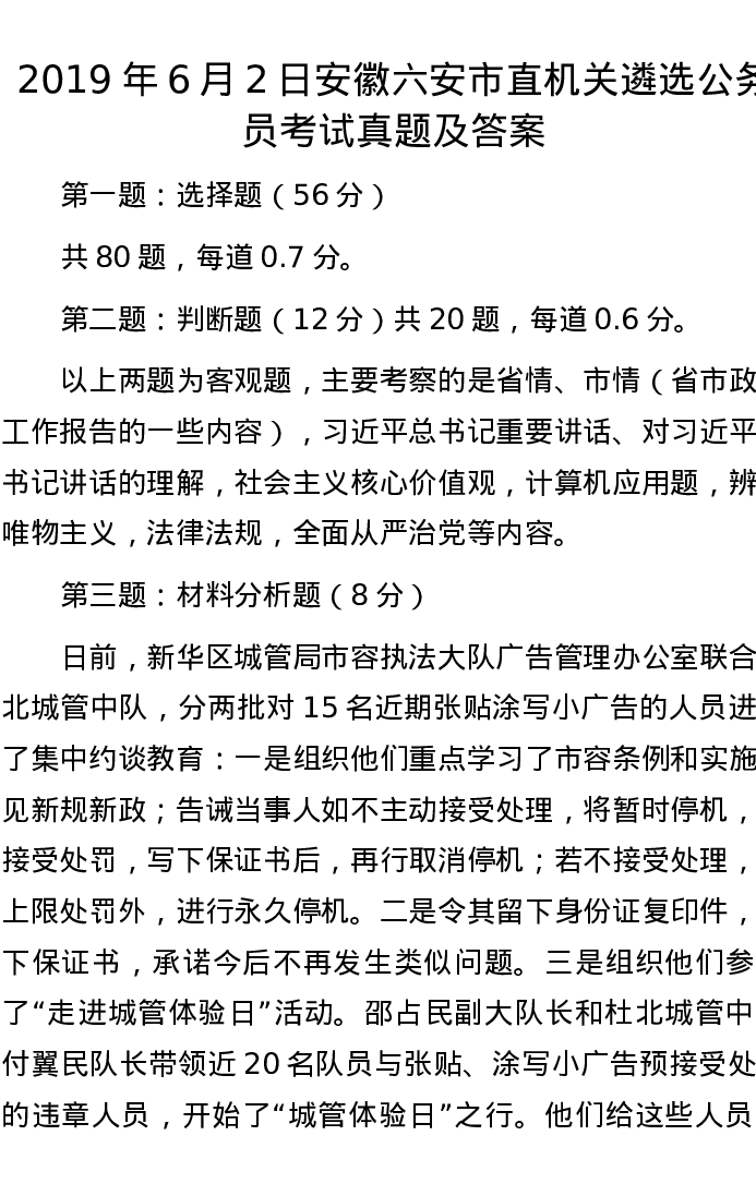 2019年6月2日安徽六安市直机关遴选公务员考试真题及答案