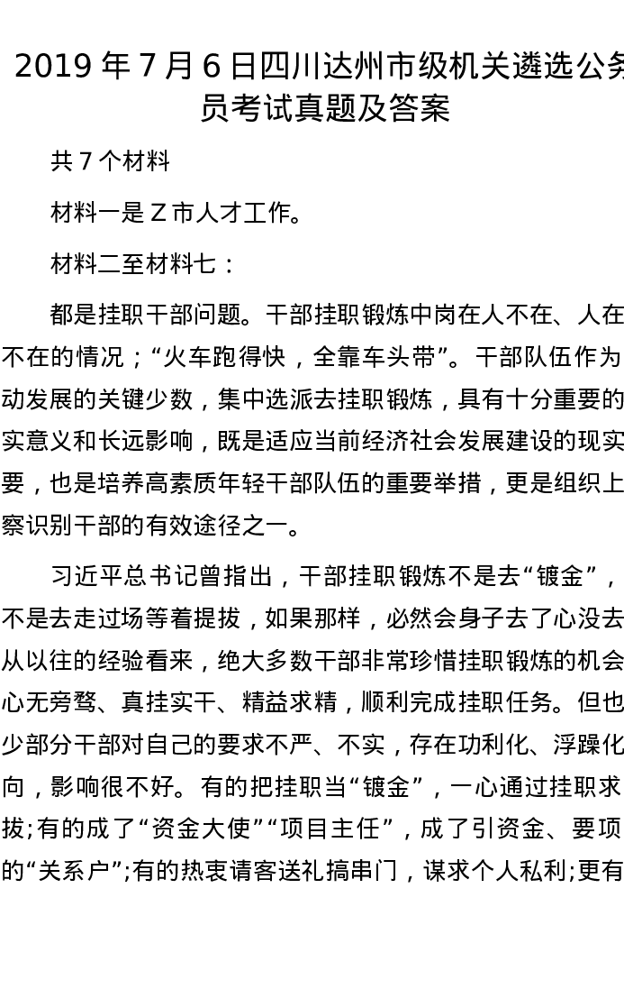 2019年7月6日四川达州市级机关遴选公务员考试真题及答案