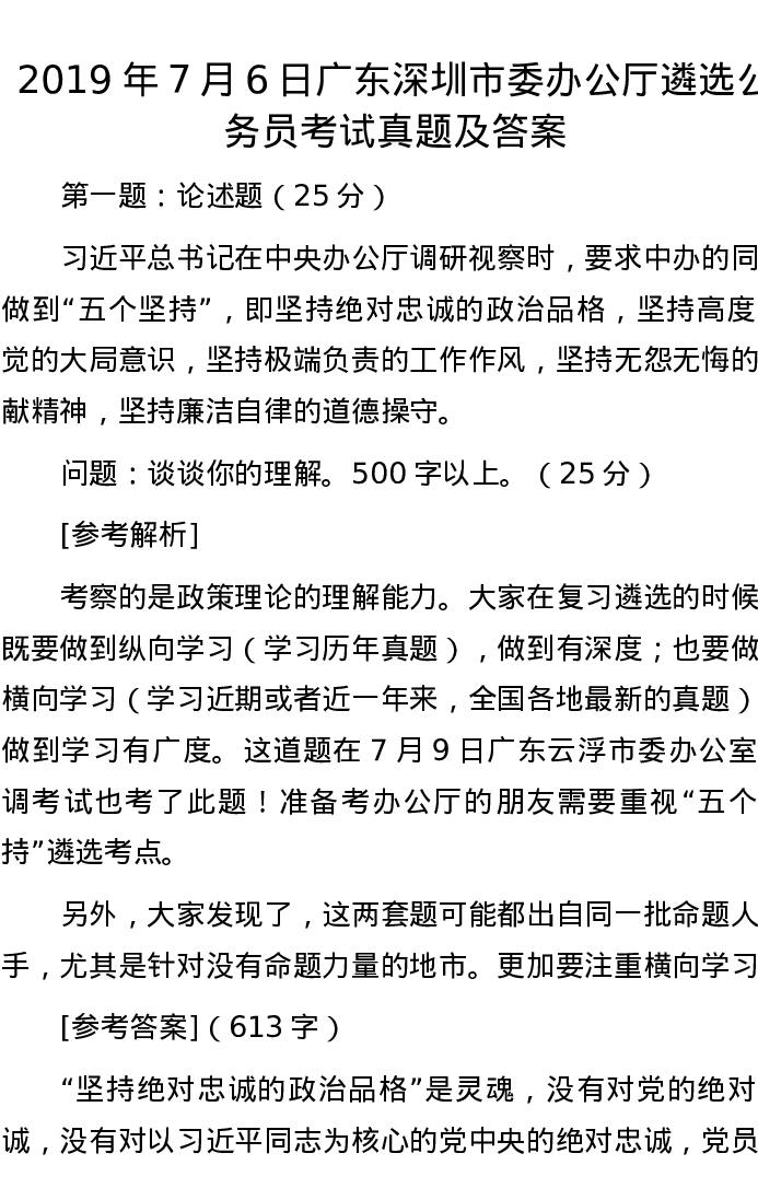 2019年7月6日广东深圳市委办公厅遴选公务员考试真题及答案