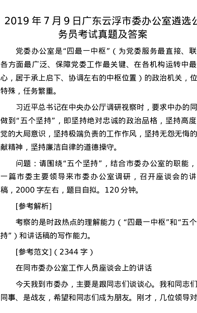 2019年7月9日广东云浮市委办公室遴选公务员考试真题及答案