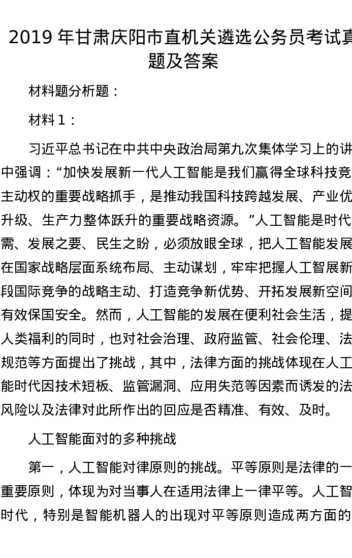 2019年甘肃庆阳市直机关遴选公务员考试真题及答案