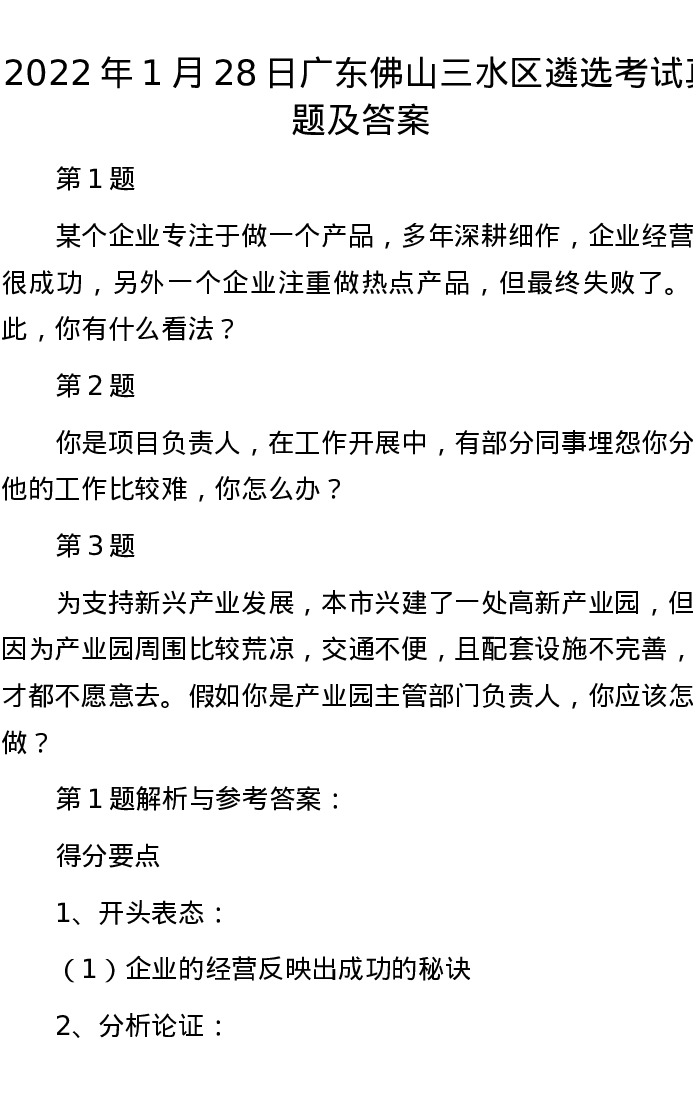 2022年1月28日广东佛山三水区遴选考试真题及答案
