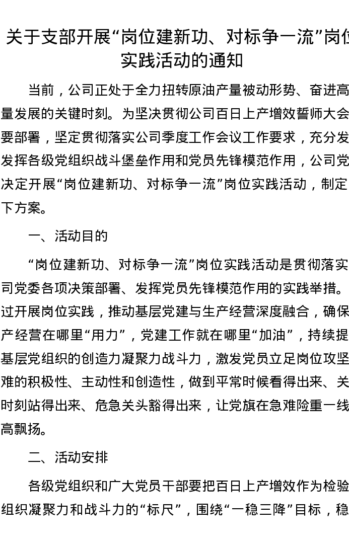 关于支部开展“岗位建新功、对标争一流”岗位实践活动的通知