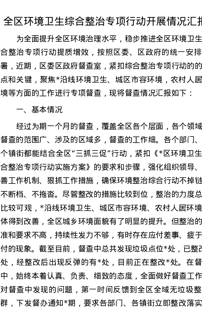 全区环境卫生综合整治专项行动开展情况汇报