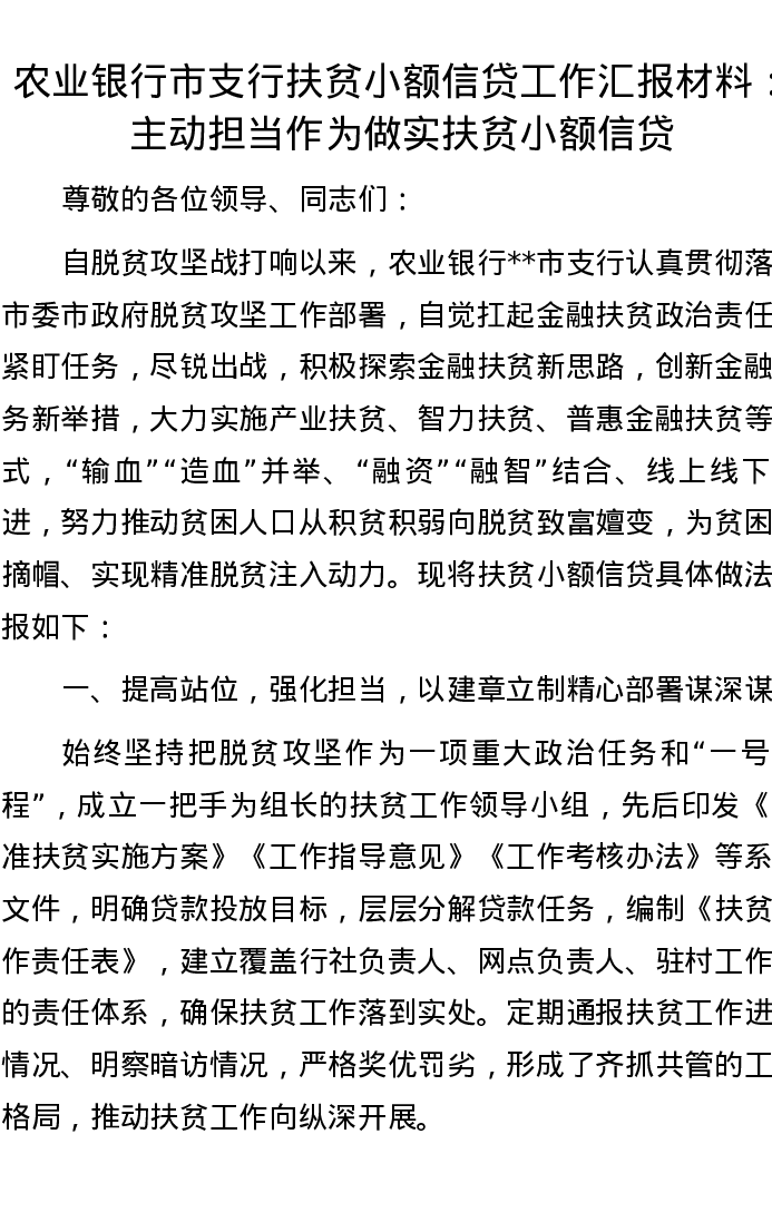 农业银行市支行扶贫小额信贷工作汇报材料:主动担当作为 做实扶贫小额信贷