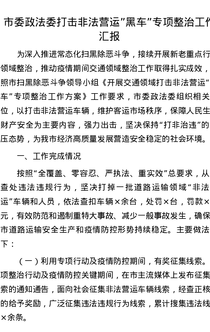 市委政法委打击非法营运”黑车”专项整治工作汇报