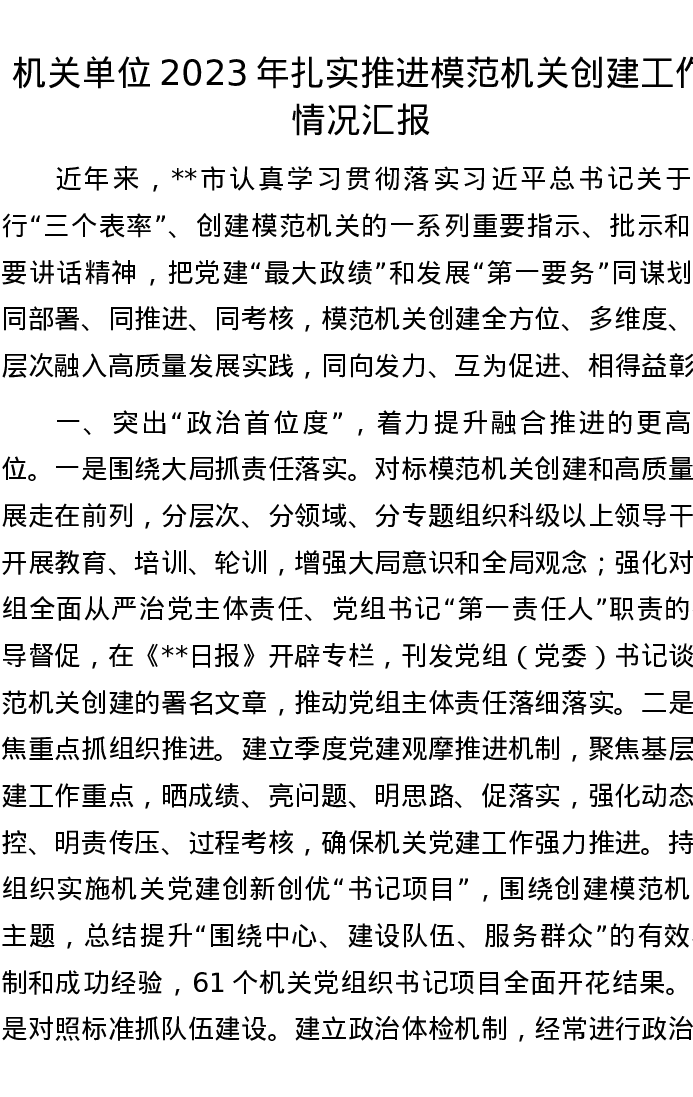 机关单位2023年扎实推进模范机关创建工作情况汇报