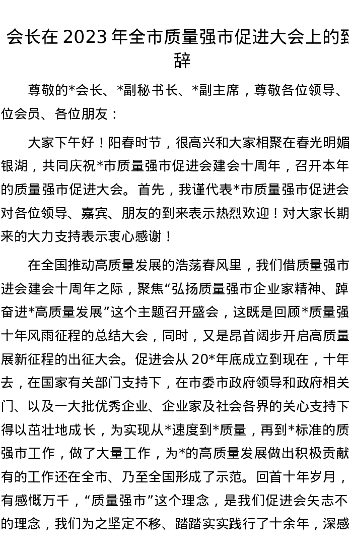 会长在2023年全市质量强市促进大会上的致辞