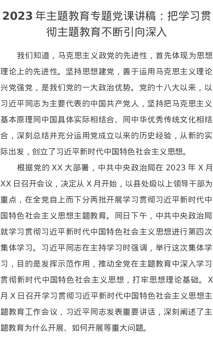 2023年主题教育专题党课讲稿:把学习贯彻主题教育不断引向深入(特色社会主义思想)