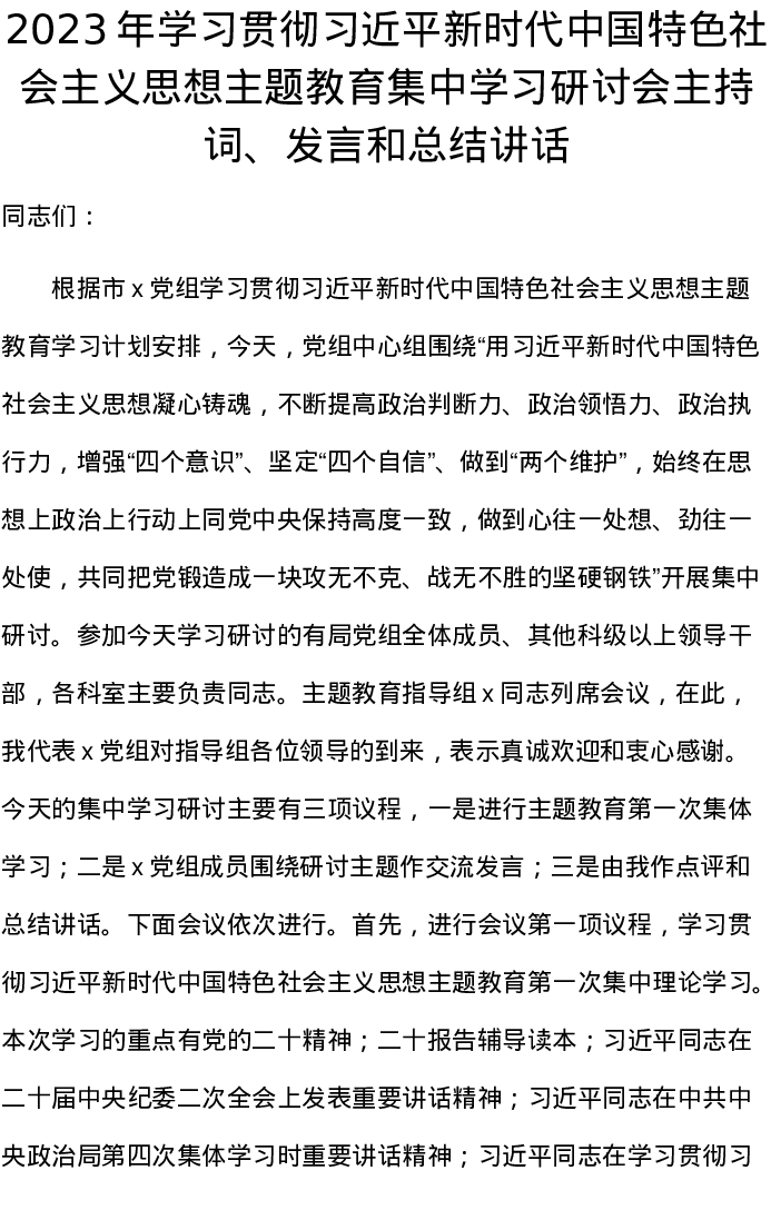2023年学习贯彻习近平新时代中国特色社会主义思想主题教育集中学习研讨会主持词、发言和总结讲话