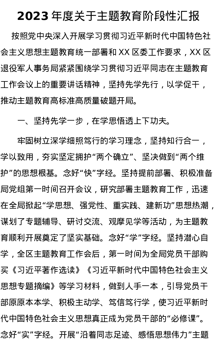 2023年度关于主题教育阶段性汇报(特色社会主义思想)