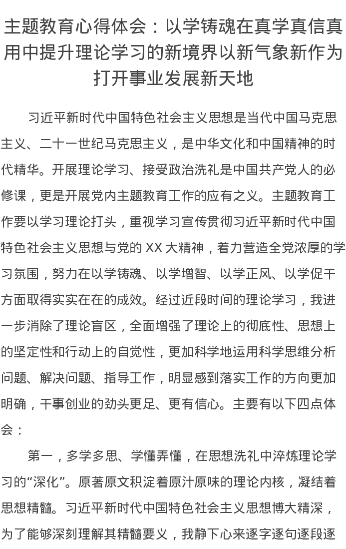 主题教育心得体会:以学铸魂在真学真信真用中提升理论学习的新境界(特色社会主义思想)
