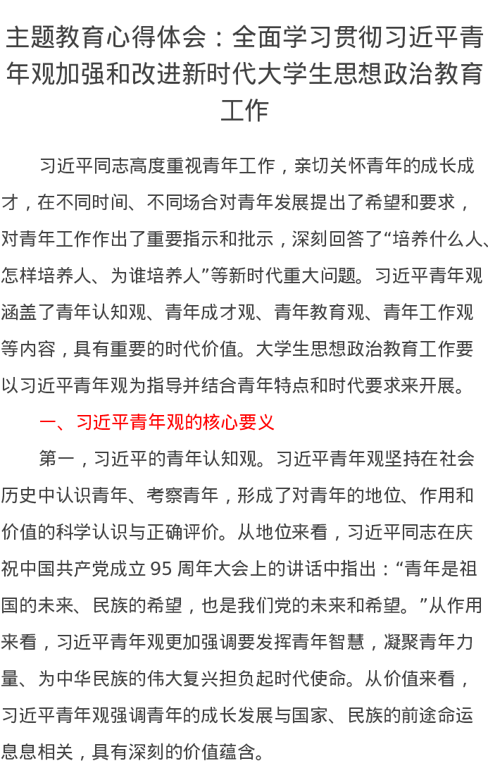 主题教育心得体会:全面学习贯彻习近平青年观加强和改进新时代大学生思想政治教育工作(特色社会主义思想)