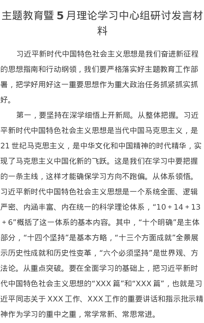 主题教育暨5月理论学习中心组研讨发言材料(特色社会主义思想)