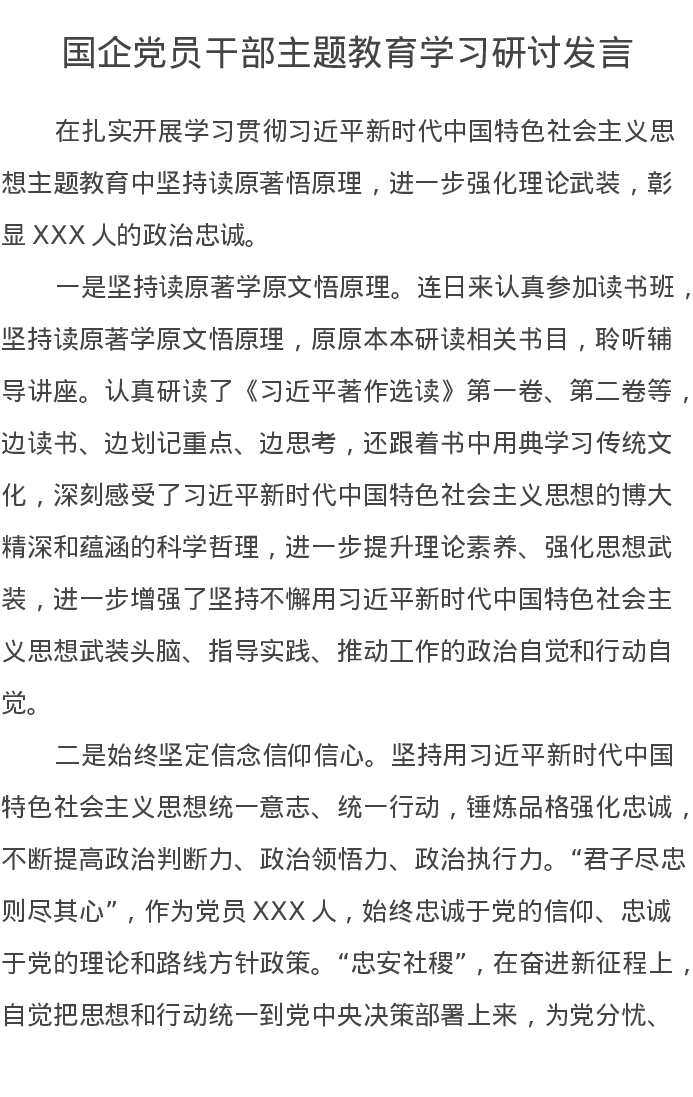 国企党员干部主题教育学习研讨发言(特色社会主义思想)