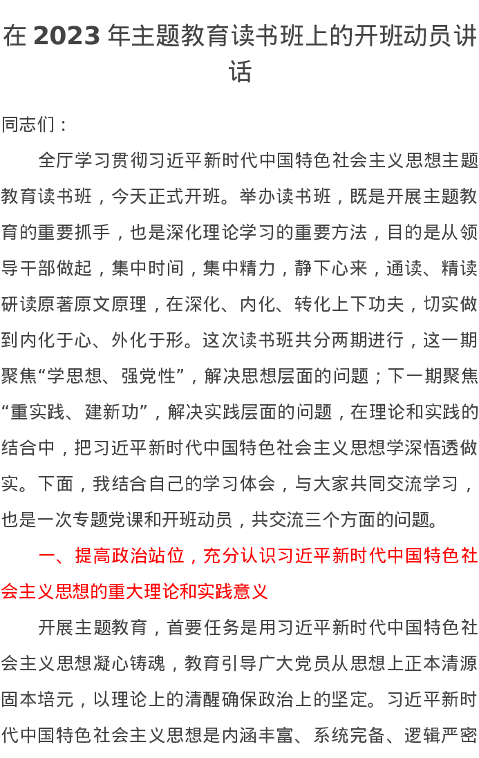 在2023年主题教育读书班上的开班动员讲话(特色社会主义思想)