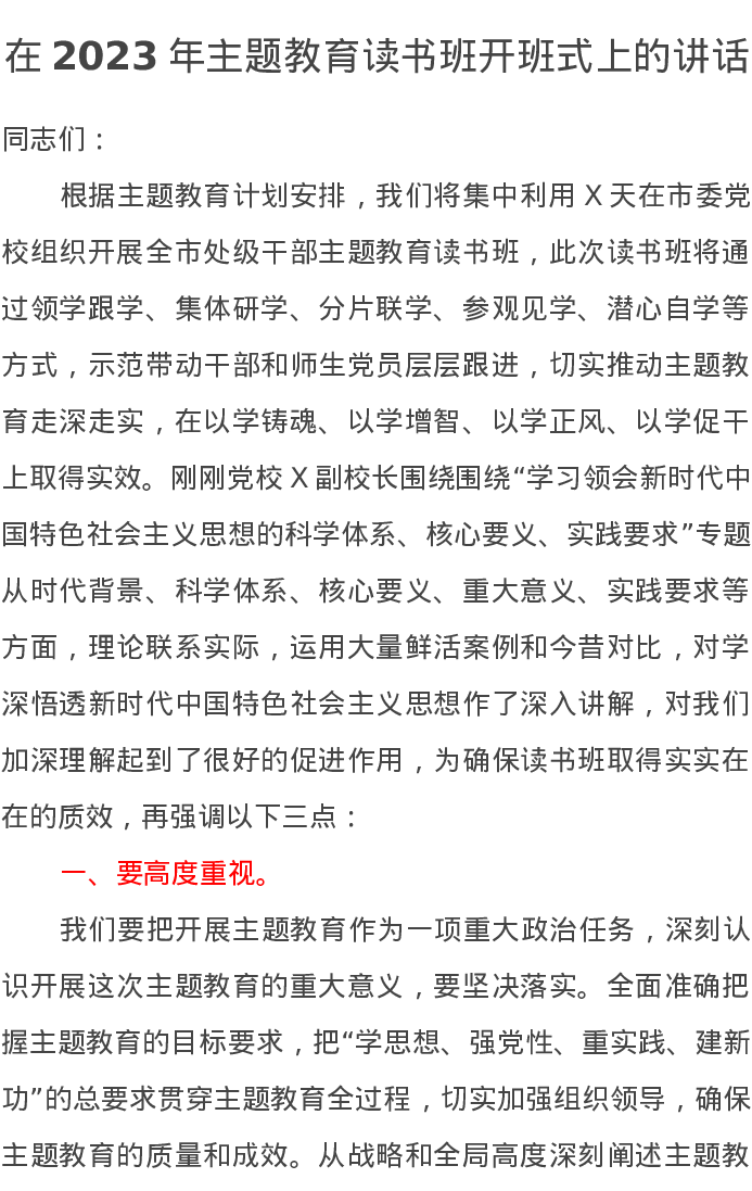 在2023年主题教育读书班开班式上的讲话(特色社会主义思想)