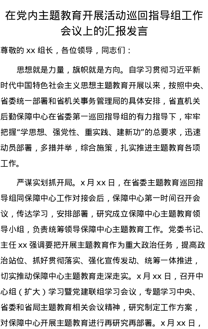 在党内主题教育开展活动巡回指导组工作会议上的汇报发言(特色社会主义思想)