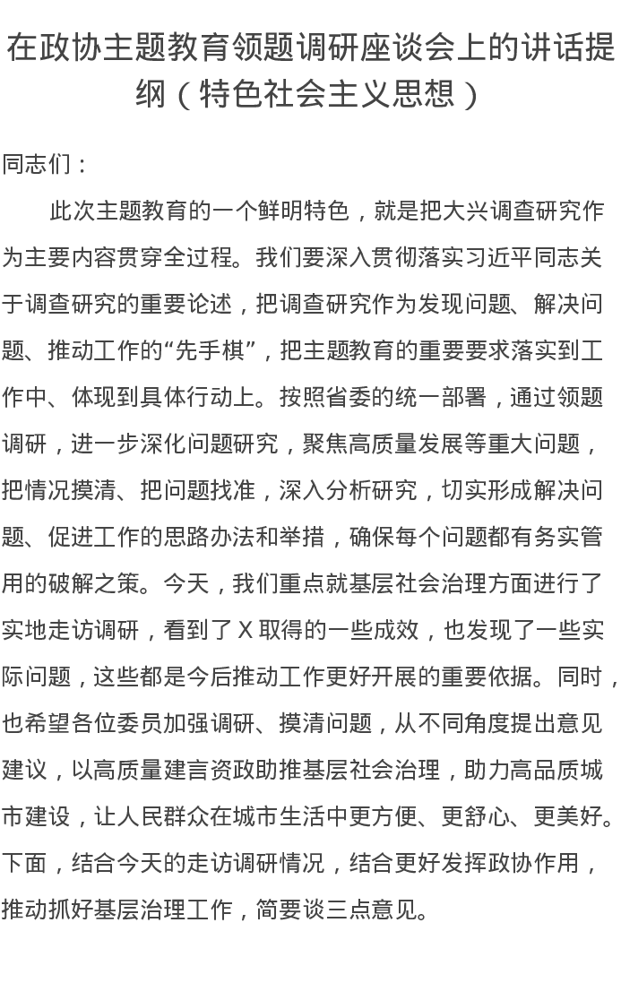 在政协主题教育领题调研座谈会上的讲话提纲(特色社会主义思想)