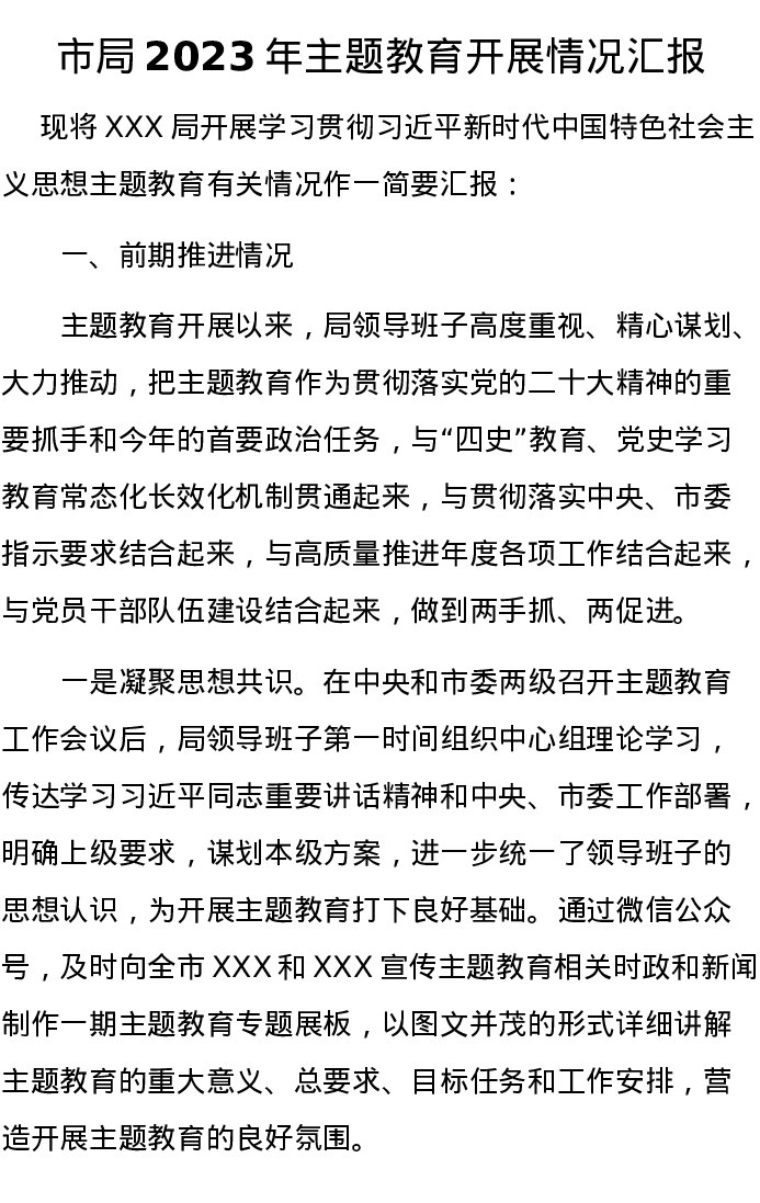 市局2023年主题教育开展情况汇报(特色社会主义思想)