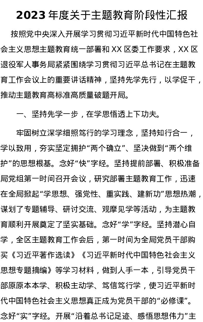 2023年度关于主题教育阶段性汇报(特色社会主义思想)