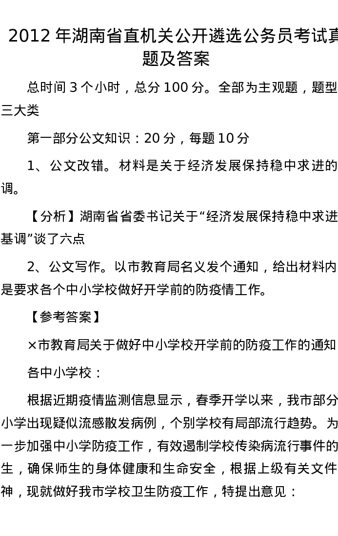 2012年湖南省直机关公开遴选公务员考试真题及答案