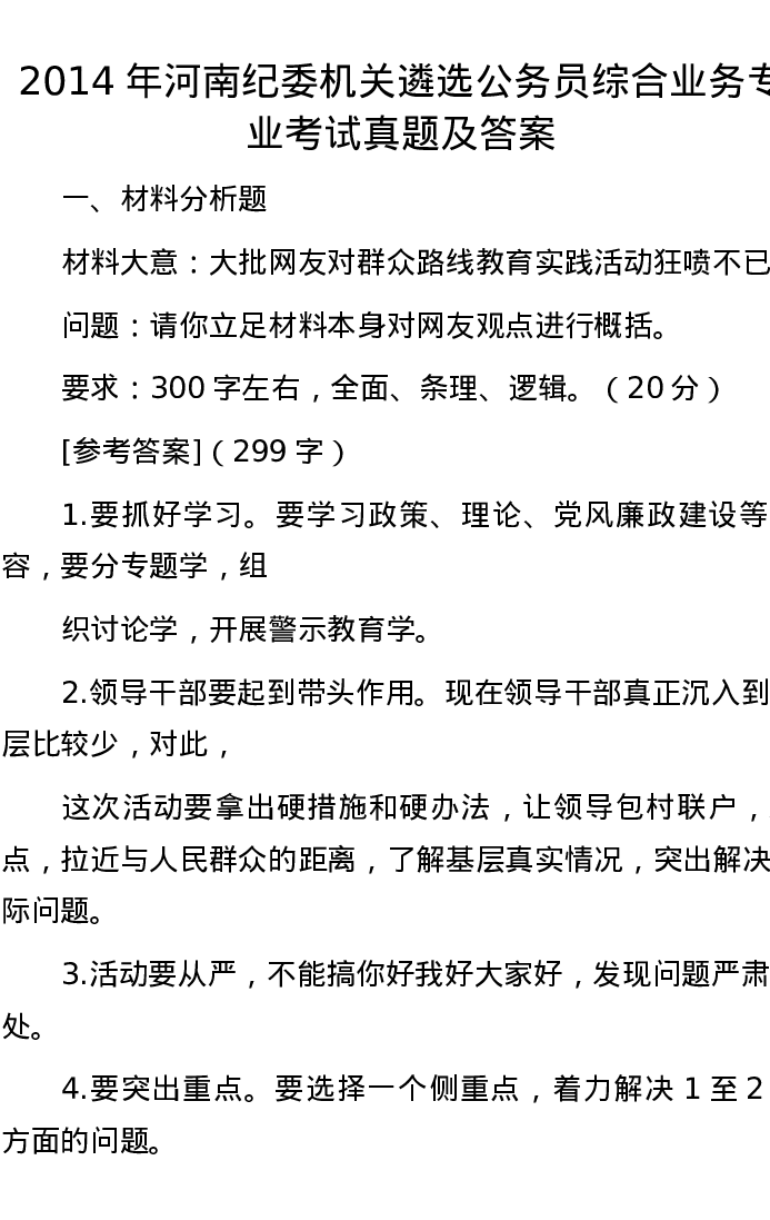 2014年河南纪委机关遴选公务员综合业务专业考试真题及答案