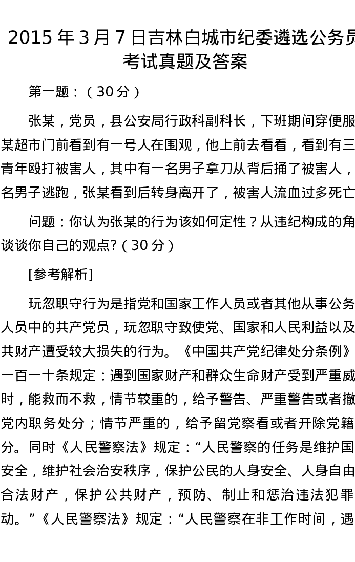 2015年3月7日吉林白城市纪委遴选公务员考试真题及答案