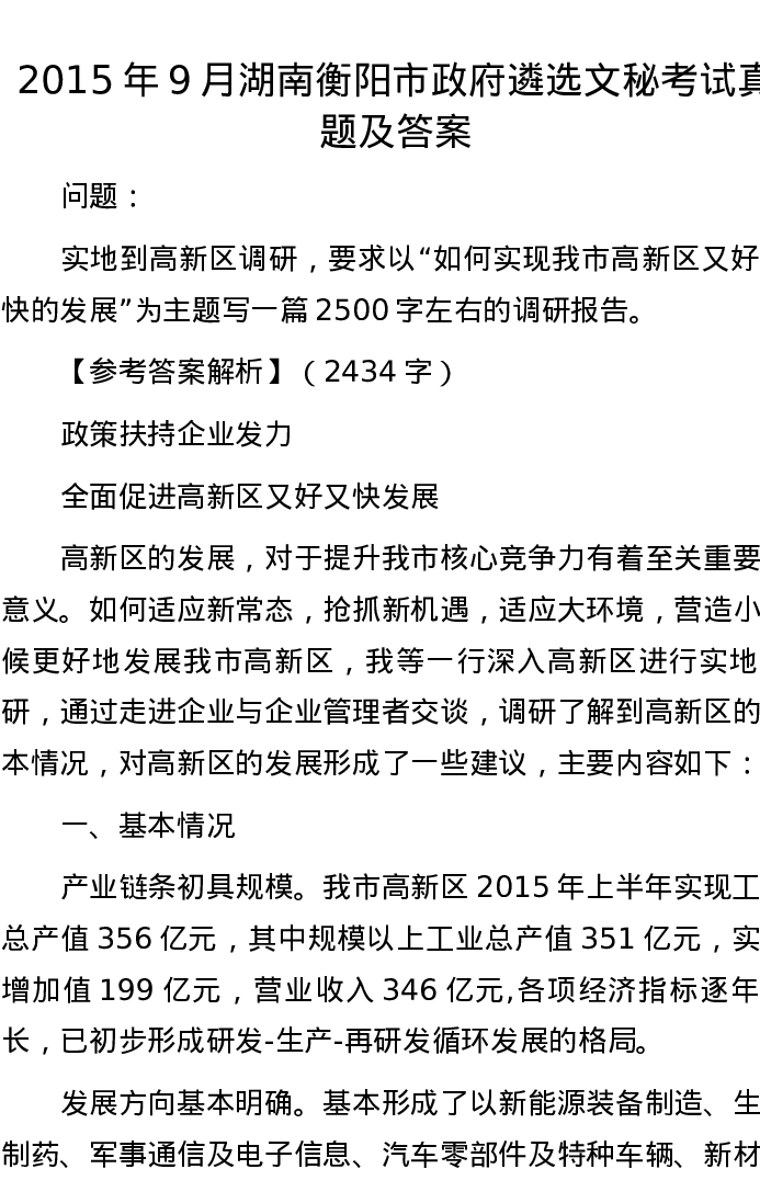 2015年9月湖南衡阳市政府遴选文秘考试真题及答案