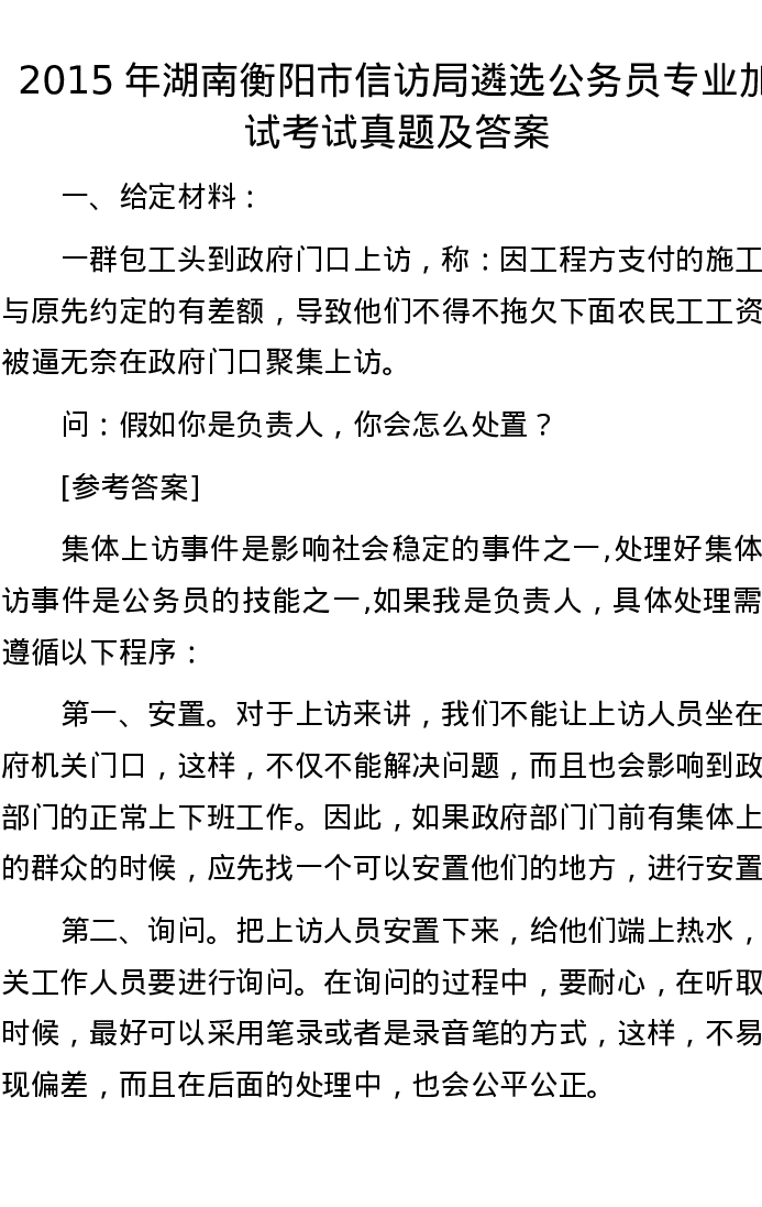 2015年湖南衡阳市信访局遴选公务员专业加试考试真题及答案