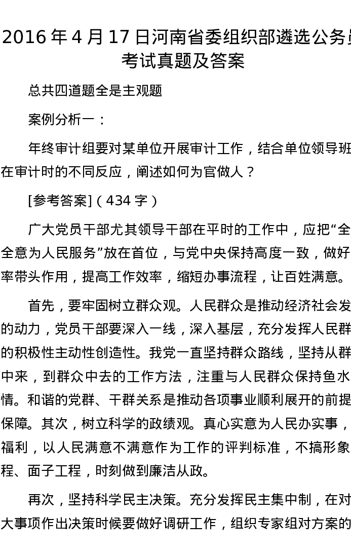 2016年4月17日河南省委组织部遴选公务员考试真题及答案