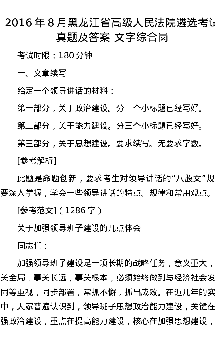 2016年8月黑龙江省高级人民法院遴选考试真题及答案-文字综合岗