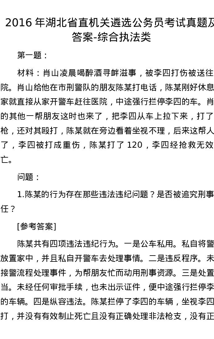 2016年湖北省直机关遴选公务员考试真题及答案-综合执法类