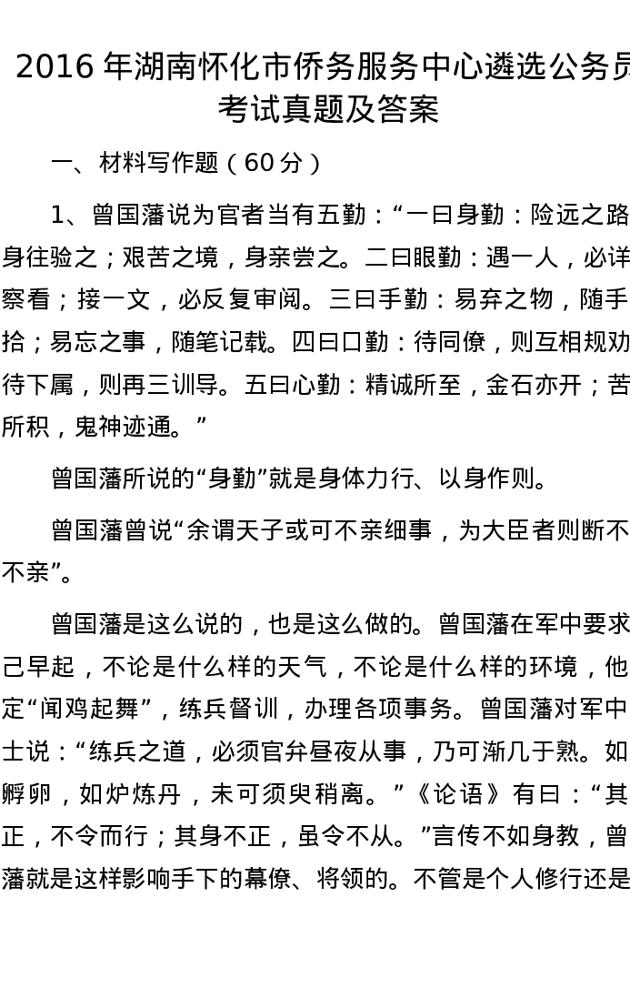 2016年湖南怀化市侨务服务中心遴选公务员考试真题及答案