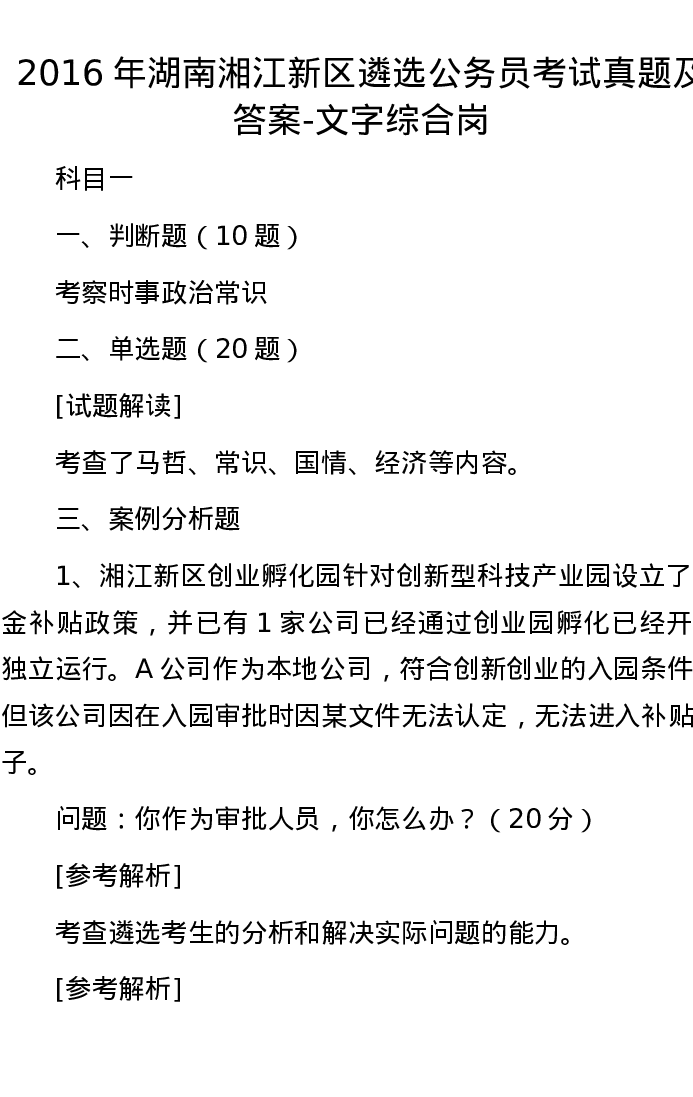2016年湖南湘江新区遴选公务员考试真题及答案-文字综合岗